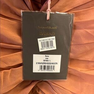This elegant rust dress features a flattering ruched design and long sleeves, perfect for any occasion.