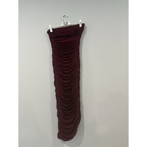 The House of CB Sasha Raisin Midi Dress in size medium is a stunning burgundy dress perfect for a party or cocktail occasion. This sleeveless, strapless dress features a ruched design and a slimming bodycon style. Made from mesh fabric, it is both lined and shaped for a flattering fit. The zip closure adds a touch of convenience, while the ruched accents give it a sexy and stylish look. Perfect for a night out, this dress is versatile and can be worn in any season of the year.