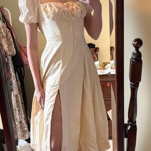 Gorgeous dress but significantly faded due to washing. It used to be a more prominent yellow with a print now it is a softer yellow with a faded print (not as noticeable now if you see the pics). Unique and stunning piece.