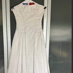 House of CB Georgiana White Cotton Strapless Midi Sundress. Size Small but I found that it ran small. Worn once and professional dry cleaned. No stains. Smoke free and pet free house. Regular Cup option which suits cup sizes A-C. Bra not necessary! Cinched waist and zipper in the back!