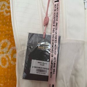 Elegant white wedding dress by House of CB. Strapless design with a fitted silhouette. Perfect for a classic bridal look.