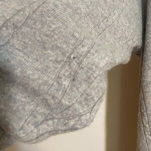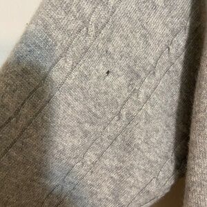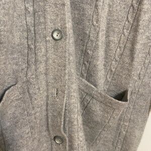 Grey cardigan has three small holes in right sleeve as shown in photos and one button missing