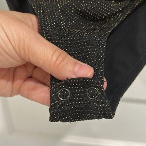 Style profile: bodysuit House of Harlow Revolve black gold metallic scoop neck long sleeve layer sexy flattering smoothing sleek