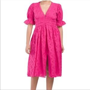 NWT! Beautiful bright pink half-button up fit and flare eyelet dress. Half sleeves in a v-neck with a ruched waist. Back zipper closure with petite lattice detail on edges of sleeves, neckline yoke and bottom hem. Poof/ puffed sleeves. Slit in front. Fully lined in 100% cotton.