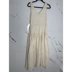Keywords: House Of Harlow 1960, embroidered midi dress, sleeveless, V-neck, linen, summer dress, eyelet embroidery, button-front, scalloped hemline, beige dress, women's fashion, garden party dress, brunch outfit, machine washable, new with tags.