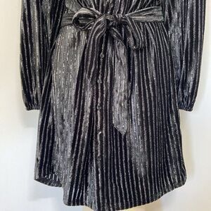 FROM HOUSE OF HARLOW 1960 HERE IS A WONDERFUL SLIP AND WRAP DUSTER. THE SLIP IS SOLID BLACK WITH ADJUSTABLE LINGERIE STRAPS. THE DUSTERI IS A POLY/METALLIC/ SPANDEX BLEND. IT IS DONE IN BLACK WITH SILVER METALLIC ACCENTS THROUGH OUT. IT FEATURES A NOTCHED COLLAR WITH A SMALL POCKET ON THE UPPER BODICE. AND LONG SLEEVES.THE DUSTER HAS A MATCHING BELT FOR THE WRAP. NWOT~SIZE SMALL, PLEASE NOTE THE MEASUREMENTS