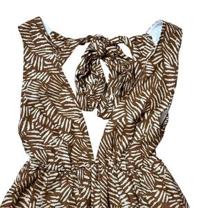 House of Harlow 1960 • In Great Condition • Open Back • Animal Print • V-Neckline • Sleeveless• Travel • Safari • Side Seam Pockets • Lined • Elastic Waist • Tie Back • Mini Dress • Colors: Brown and White