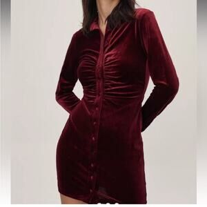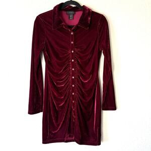 Excellent used condition! Beautiful deep burgundy wine colored button up dress. Long sleeved with a classic collar. Luxurious faux velvet velour. Unlined and stretchy in a pop over style with no closure. Flattering ruching at waist and hips in a short above the knee length.