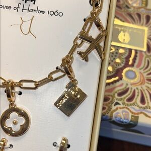 House of Harlow gold charm necklace with removable charms ~ Features pearl heart, pearl bow, coffee cup (says coffee), compass, airplane, passport, Van Cleef dupe and envelope charms. Perfect for mix and match for whatever your vibe is.