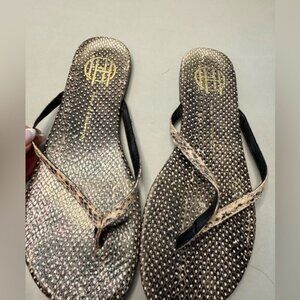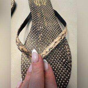 Authentic House of Harlow 1960 Colton flip-flop sandals in women’s size 7. These chic, slim-strapped thong sandals feature a striking green and black snake-embossed leather finish. Crafted with a genuine leather upper and lining, plus a rubber sole for comfort and durability.