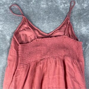 Description- knee to mini length. Eyelet like design. Smocking in back. Salmon like color.