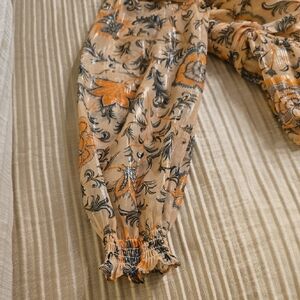 EUC Elegant blouse with floral pattern and puff sleeves. Features a statement front figure. Please see the pictures for the measurements.