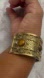 Elegant gold bracelet with intricate patterns. Features brown stone accents. Perfect for any occasion.