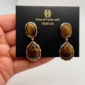 These exquisite earrings from House of Harlow 1960 feature a stunning combination of gold-toned metal and rich brown stones. The elegant stud design showcases oval cabochon stones, adding a touch of sophistication to any ensemble.