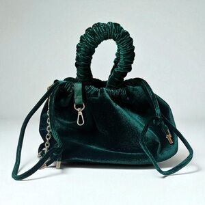 Stunning House of Harlow handbag crafted in a luxurious emerald green velvet. Featuring chic ruched top handles for hand carrying and a detachable silver-toned chain and matching velvet shoulder strap for versatile wear.