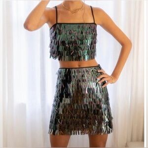 Dazzle in this iridescent blue fringe skirt set. Perfect for a night out