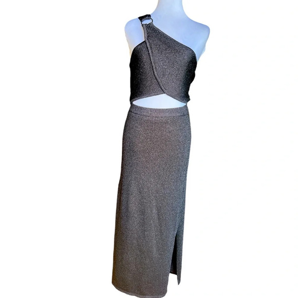 Shine bright in this stunning New with tags House of Harlow 1960 two-piece set, perfect for making a statement. This metallic set includes a chic one-shoulder crop top with a unique cutout detail and a matching high-waisted midi skirt with a side slit. Crafted from a blend of polyester and metallic fabric, this set adds the perfect shimmer for a night out, party, or special event. Designed to hug your curves, this outfit is both bold and flattering.