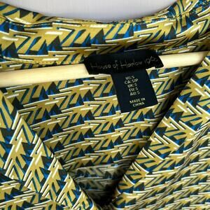 Add a touch of retro flair to your wardrobe with this House of Harlow 1960 button-up shirt. Featuring a bold geometric print in golden yellow, blue, black, and white, this satin-like blouse is both eye-catching and effortlessly cool.