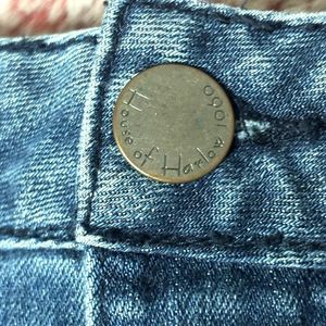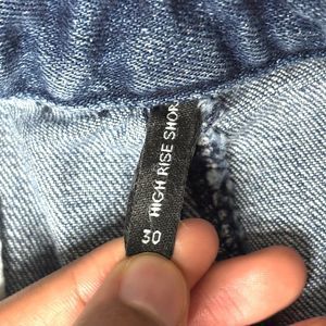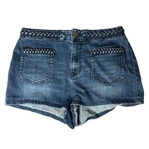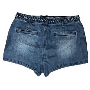 House of Harlow 1960 Revolve brand cute braided detail woven accent dark wash high rise button and zip closure classic grunge retro summer spring unique bike riding functional open front pockets back faux pockets blue denim jean shorts size 30.