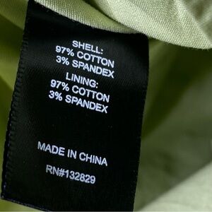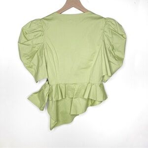 Light green wrap top with ring closure. Puff sleeves, asymmetrical hem