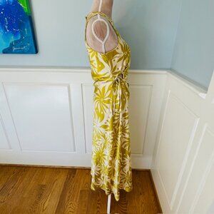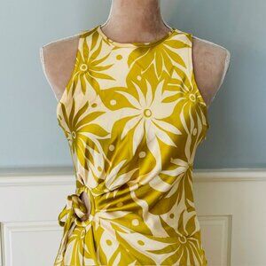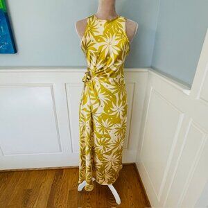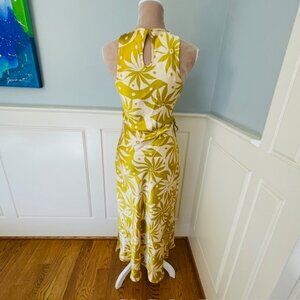 House of Harlow 1960 Golden Chartreuse Floral Print Tropical Sleeveless Maxi Satin Finish Dress. Gorgeous High Neck Tank Style Colorful Dress With Side Zip. Adjustable Side Cut Out At Waist, Ruching. Fitted and Flattering Boho Satin Maxi Dress, 100% Polyester, Hand Wash.