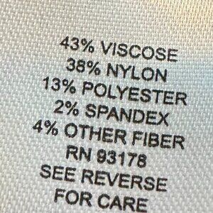 43% viscose/38% nylon/13% polyester/2% spandex/2% other fibers