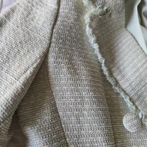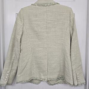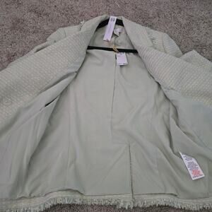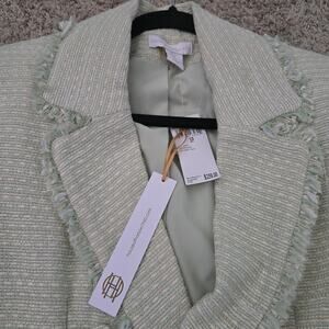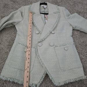 Elevate your wardrobe with this chic House of Harlow 1960 tweed blazer. The green color and double-breasted design offer a sophisticated look, while the fringe detailing adds a touch of playfulness. Perfect for both professional and casual settings, this size small blazer is a must-have.