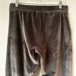 Super soft and comfy gunmetal grey/dark purple velour pants. Can be dressed up or down. Day to night. Drawstring elastic waistband. 2 front pockets. 95% Polyester, 5% Spandex