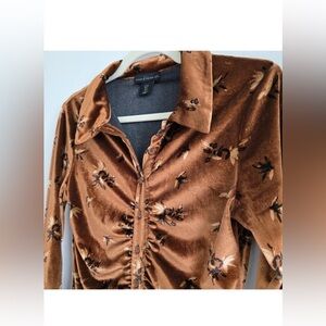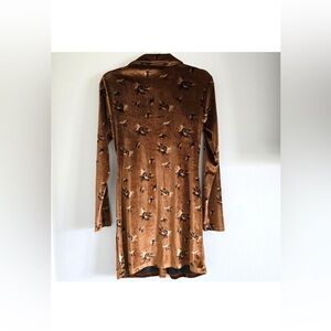 Step into vintage-inspired glam with this luxe House of Harlow 1960 velvet mini dress. Designed in a warm bronze tone with a delicate floral print, this dress features flattering front ruching, a button-down closure, and a structured collar for a chic, tailored edge. With a soft velvet feel and body-skimming silhouette, it’s the perfect piece for fall parties, date nights, or layering under a faux fur coat for colder weather.