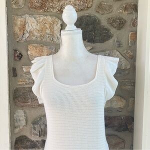 Elegant white midi dress with ruffle details. Perfect for any occasion. Soft fabric and flattering fit.