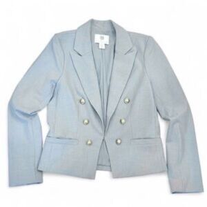 Excellent condition. Women’s House of Harlow 1960 powder blue blazer jacket. Gold button front, hook & eye close, long sleeves with 5 button cuff, polyester, rayon & spandex blend. Size medium. See photo for measurements