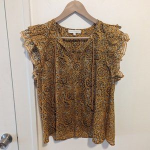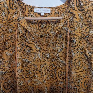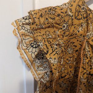 Effortless cotton blouse! This top features a v-neckline with tie detail and ruffled sleeves. Airy cotton fabrication, pullover styling. Mustard yellow color with black/white floral block print design.