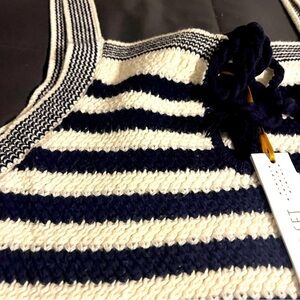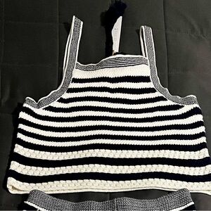 Flattering House of Harlow 2-piece knit cotton 2 toned navy blue and white tank & short set w/drawstring. Twist tassel closure tank. Stretch waist with drawstring.