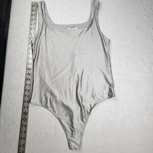 Luxurious House of Harlow scoop neck grey bodysuit thong with lining, soft silky size medium. Classic, versatile, fancy, shine, contour shape, dressy, contemporary, comfortable.