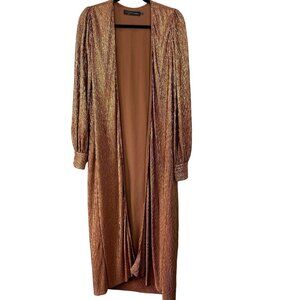 * Features: copper metallic fabric, open front, ankle grazing length, 100% polyester, cuffs, raw cut edges, pleated duster