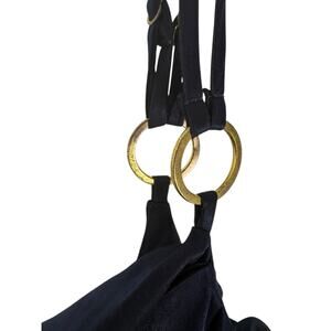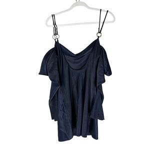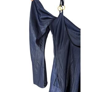 Embodying quintessential boho glam with an LA cool vibe, this navy sateen mini dress features an alluring off-shoulder design and chic ring accents. The luxurious fabric offers a smooth, fluid drape perfect for making a sophisticated statement at any event.