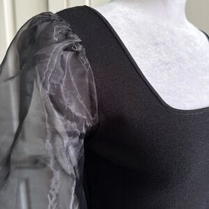 This dress is so chic! From the ultra popular boho brand House of Harlow 1960, features include a stretch bodycon fit, square neckline, puffed sheer organza sleeves with structured cuffs, modest knee length and slip on style. Primary textile is a fine black knit with plenty of stretch. Excellent condition!