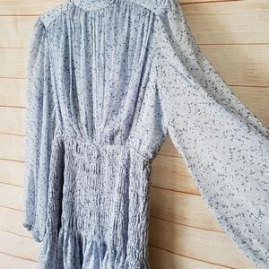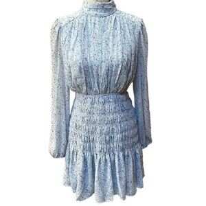 House of Harlow 1960/Revolve Floral Smocked Ruffle High Neck Mini Dress in Blue