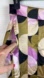 House of Harlow 60s groovy vibe satin two-piece pant set with geometric mid. Print in purple pink, bronze, tan, and black. Includes a long-sleeve button front cropped blouse and elastic back high waist wide-leg pants with zip fly.