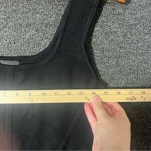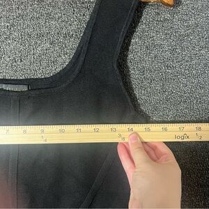 Elevate your wardrobe with this sleek black sleeveless top. Perfect for any occasion, it offers a stylish and versatile look. - see all flaws in images - measurements in photos