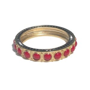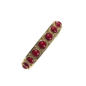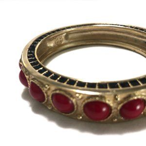 This 14k gold-plated bangle features resin cabochons and faceted black rhinestones. 1/2" wide. 2.5" diameter.