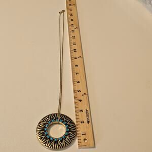 House of Harlow 1960 tribal circle pendant necklace. Gold sunburst design with black contrast and turquoise tone cabochons. Large size, at almost 3 inches. On a long gold chain with adjustable lobster clasp closure with House of Harlow logo tag.