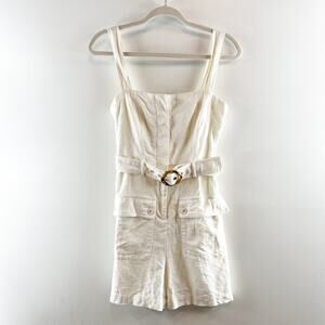 wide straps, square neckline, zip and button up, pockets, linen, utility, one piece, shorts, white, summer