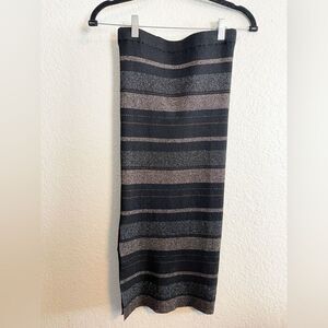Edgy knit skirt to wear out to a party or special occasion. Has a stretchy body con fit with some metallic shine. Waist 13”, length 30”. Like new condition. Questions? Leave a comment below!