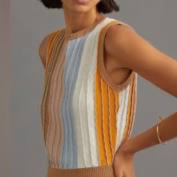 House of Harlow striped sleeveless sweater featuring a vertical striped pattern in goldenrod, tan, peach, light blue, and cream accented with metallic silver. Rounded neckline. So cute! Can be worn on its own or layered over a button-down, t-shirt, etc.