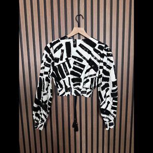 House of Harlow Top Small Womens Geometric Linen Crop Elastic Waist Long Sleeve