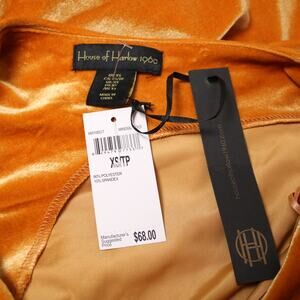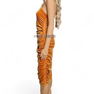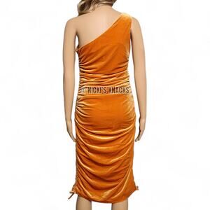 Turn heads in this luxe House of Harlow 1960 one-shoulder velvet dress in Mineral Gold, size XS. The rich amber hue and shimmering velvet fabric bring bold glam to any night out. Featuring a ruched silhouette, adjustable side ties, and asymmetrical neckline, this dress flatters with comfort and drama. Fully lined with stretch and side zip for a sleek fit.