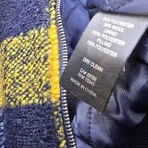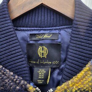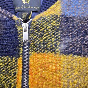 Step up your style with this bold and cozy House of Harlow 1960 cropped bomber jacket in an eye-catching blue and yellow plaid wool blend. Fully lined with a soft satin interior and insulated for warmth, it features a sturdy front zip, ribbed collar and cuffs, and a modern cropped cut. Size XS – great for fall and winter layering.