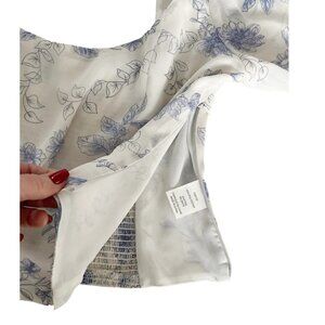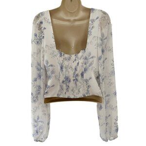 House of Harlow woman's light gray or soft white smocked back crop top with blue floral print. Top has a sweetheart neckline and flowy balloon sleeves. It's made of 100% polyester and is a woman's size small.
