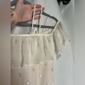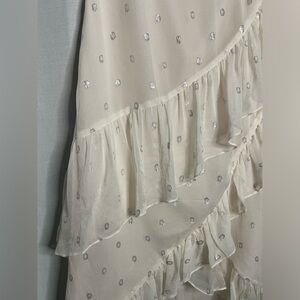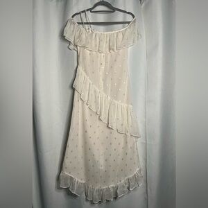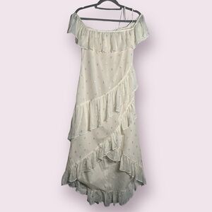 House of Harlow x Revolve Ivory White Layered Midi Dress. Cream white color with silver metallic polka dots. Layered ruffle midi length. Off the shoulder with 2 skinny adjustable spaghetti straps on one side. Hidden zipper up the back. Perfect for a bride to be, bachelorette, bridal shower, honeymoon. Size Small.